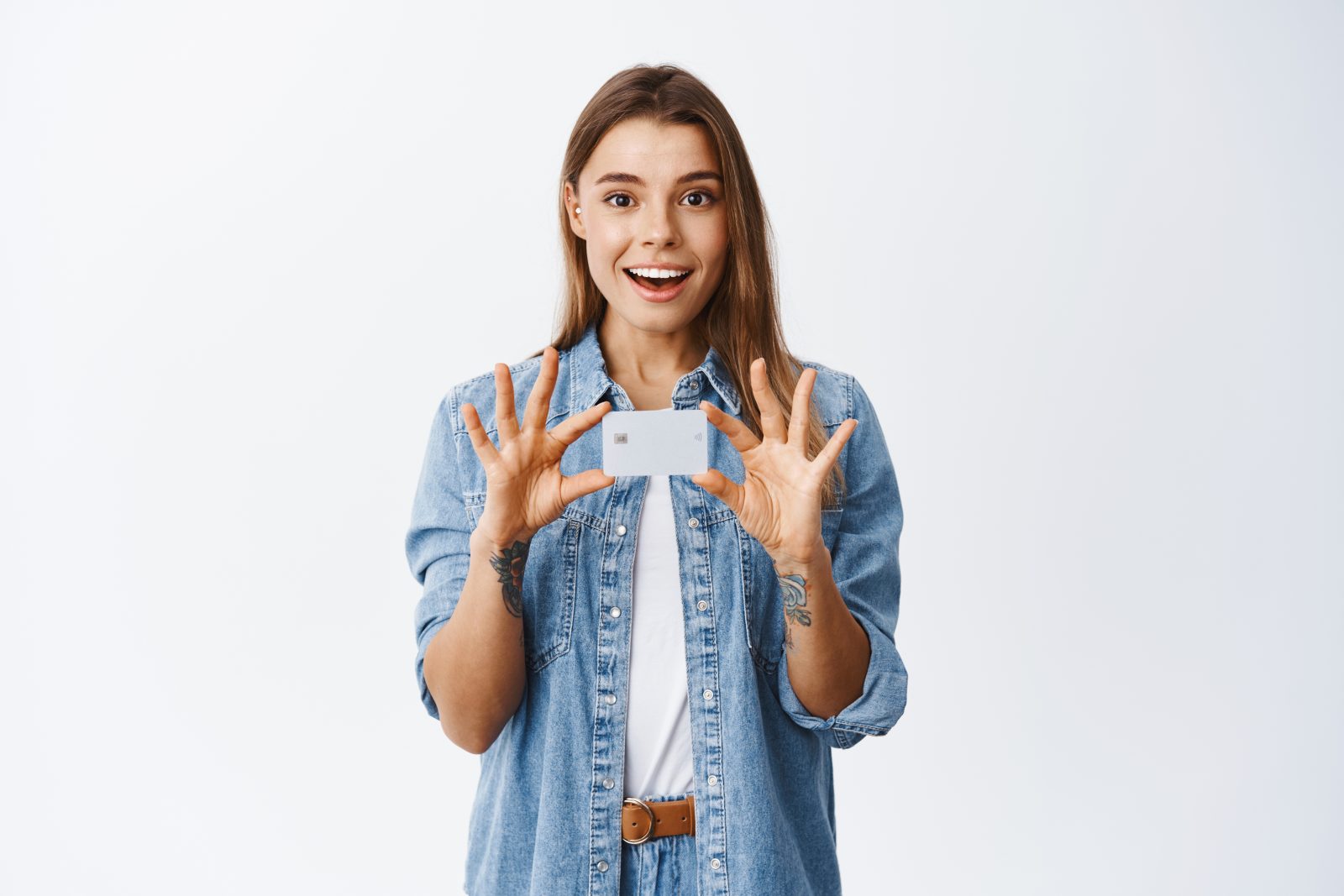 Portrait of smiling and surprised young woman holding plastic credit card in hands over chest, advertising new banking feature, recommending bank, white background.